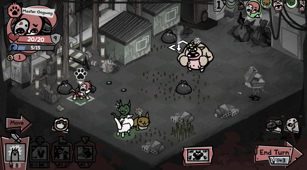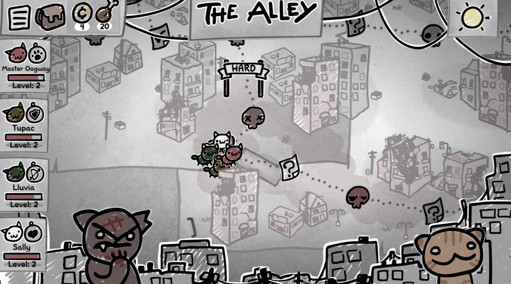 The fighting system is where things start to get real interesting. Between the environment around you, and the unique abilities of your cats, (which you will gain more of as you progress and level), you can really begin to utilize a bit of thinking and strategy into your turns. This game is all about synergy, developing combos and finding the right attacks, abilities, and environmental setups to find success in combat. Want to do large AoE damage? Get a whole cluster of enemies wet via rain or other water sources, and give them a quick tap with an electric ability. Want an army of adorable ferocious pet rocks? Combo a cat’s Pet Rock passive, which turns all rocks you create into combat-ready pebbles, with the Earthquake ability, that has a chance to spawn rocks with each use. Just like in The Binding Of Isaac, the key to progress is a combination of great stats, abilities, and items, then finding ways to synergize that all together into one big conglomerate of success.