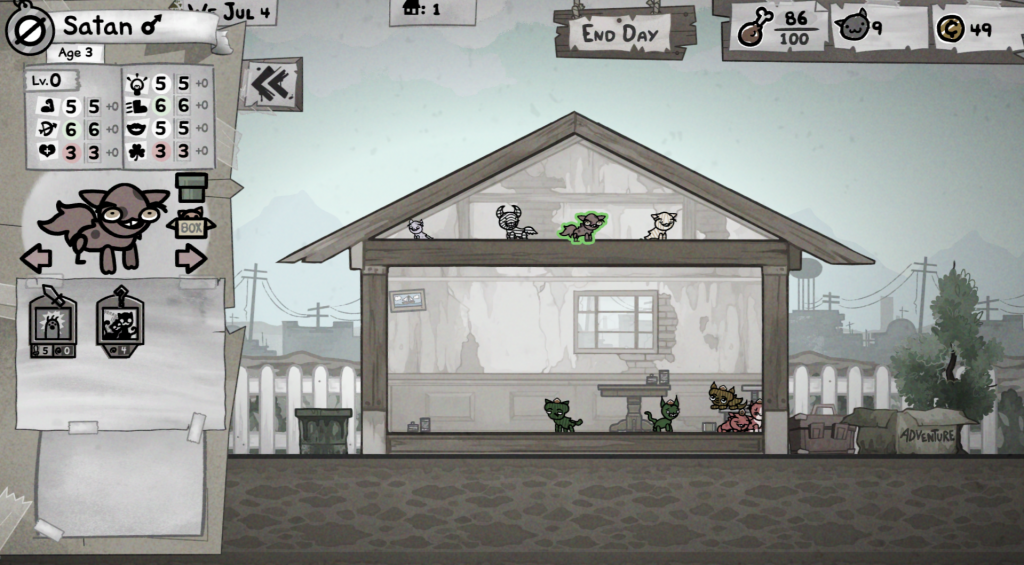 If you’re unfamiliar with Edmund’s previous work, you may be noticing his very unorthodox humor by now. Just like the games he’s worked on in the past, Mewgenics has a very dark and bizarre comedic aspect to it. A few saucy innuendos sprinkled in, just a dash of demonic sacrificing, some modern-day personality stereotyping here and there, and a good bit of what can only be described as “proper fucked-up comedy.” I, personally, have always been a fan of the man’s outlandish humor, but I know a good few folks who aren’t fans of his jokes, like the ones about the alleyway fetuses and “that neighbor who claims he’s straight and has a wife, but is absolutely a gay man.” If you tend to steer clear of dark, crude jokes and exaggerated stereotypes of modern day issues and people, this game might not be your thing, but that’s okay! Whether you’re a fan or not, this game still has a recognizable charm to it, and it’s clear to see how it has drawn in plenty of players.
