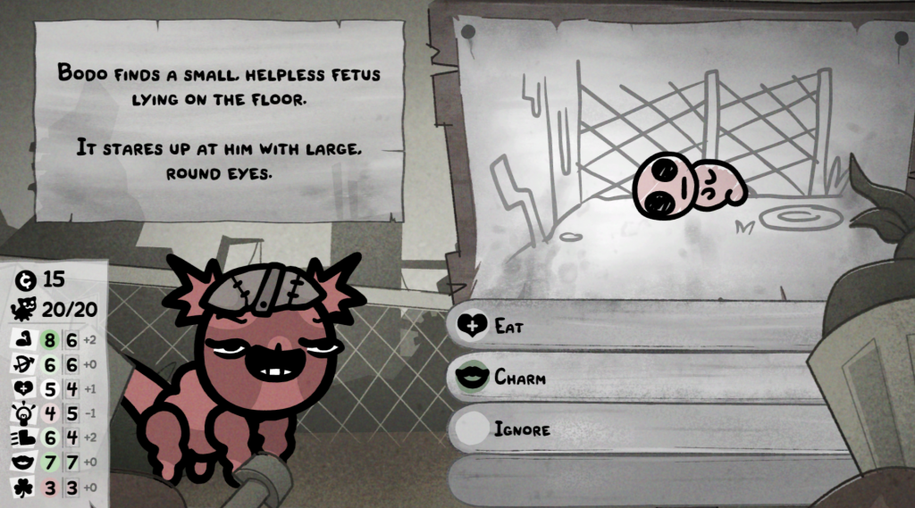 Mewgenics boasts a unique and recognizable art style, comparable to that of Edmund’s previous games, as well as an interesting roguelite system that keeps things fresh and replayable. Your goal is to become what is essentially a crazy cat lady’s dream, collecting strays with questionable names off the street and breeding them together to amass your own little cat army. Each cat has its own set of stats and unique perks, and these details come in real handy once you get to the combat. The game has you select 4 of your adult cats to form a “team,” allowing you to select roles for them based on what you feel their stats would be good for, such as a Tank, Fighter, or Mage. I, personally, tend to rock the Tank, Fighter, Cleric, and Mage/Ranger combo, as I feel it gives me the best outcomes in fights. Then, once you’ve got your team put together, the game sets you off through various maps, with difficulty scaling as you progress through them. You’ll move your way through them, entering turn-based fights, finding loot, or running into randomized situations that’ll utilize a cat’s stats to improve chances of a successful outcome to them. Ever want to try to charm an abandoned fetus in an alleyway to be your friend? Now you can, if your Charisma is high enough.
